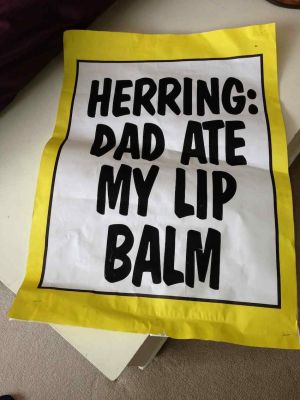 It was a long and tiring journey to Devon and then another couple of hours for us to get back to Cheddar where we're based for the next few days. We were all blasted by the time we got back to my parents' house and went to bed straight away. My dad had laid an advert from one of the hoardings for a recent Cheddar Valley Gazette out on the bed. It read "Herring: Dad Ate My Lip Balm". It's hardly Freddie Starr ate my hamster, but it's as close as we'll get in this small town. It referred to