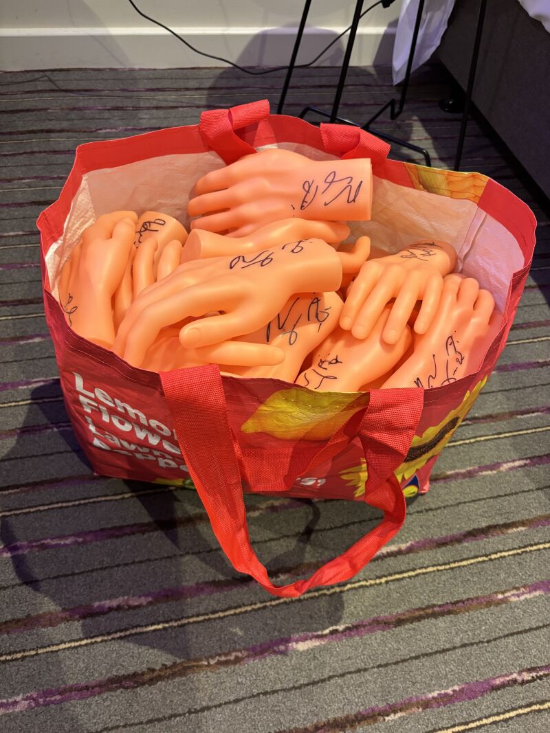 Once at the theatre I met Chris and Ben Evans (not those two) who had brought more kickstarter rewards for me to sign, including a bag of Rod Hull style false hands. More people had wanted one of these than you might think and it did feel strange to not only sign a disembodied hand, but then put it in a bag of disembodied hands. Even though they were clearly plastic it still made me feel a bit weird. I don't think I am cut out to be a serial killer. But then saying that would be the perfect alibi. I wondered if my guests might be freaked out by a shopping bag full of severed hands in the dressing room. What had they signed up for? But I guess if I was to kill all my guests that I could probably get quite a bit of cash for their severed hands (and other extremities) on ebay.