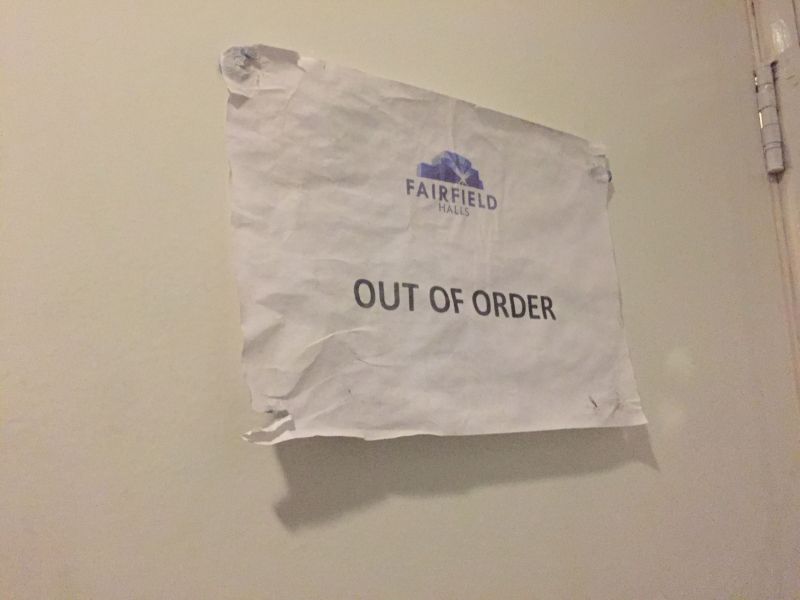 The toilet in my dressing room had a sign hanging up on the inside of the door saying “Out of Order†which made it appear that the toilet was working fine, but everything outside the door was broken. I don't know if it meant the rest of the Fairfield Halls, or the whole of Croydon or maybe the whole world. But it seemed about right. Stay in the toilet, because the rest of the planet is fucked mate. You're safe in here. It could be the start of a film. Sit down on the loo, see the sign, open the door and the world is in chaos.