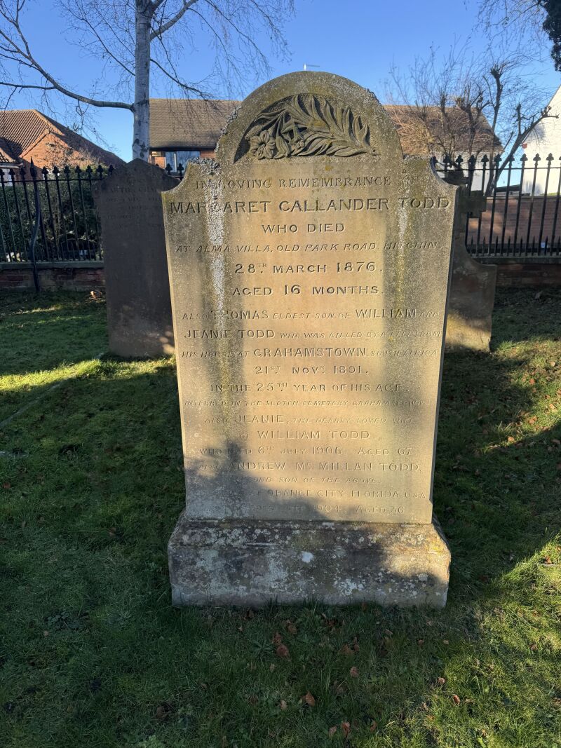 I like this gravestone as it attempts to give more info than usual, though only about the people involved deaths and not their lives, which seems a waste of words. Though interesting to know that Thomas (presumably Margaret's brother) was killed by a fall from his horse at Grahamstown, South Africa in 1891 (it also lets us know where his body is - if anyone in Grahamstown wants to go and have a look). It gives a glimpse into his life, his travels, his love of horse-riding (or maybe it was his first go).