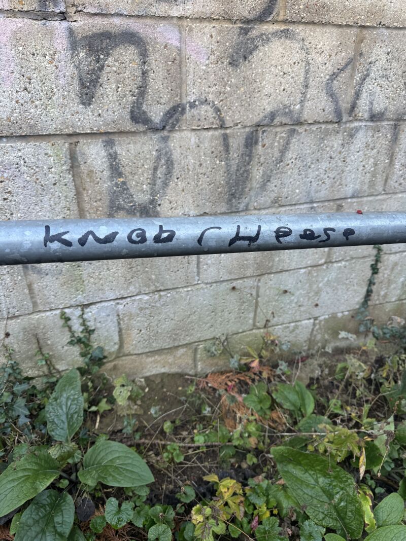 I continued to explore Hitchin, taking paths I'd not been on before. Down one alleyway I saw someone else's attempt to achieve some kind of immortality, as they'd put graffiti on a metal railing. It simply said "Knob Cheese" (actually "KNob CHeese" which makes it look like a crossword clue from Minute Cryptic).