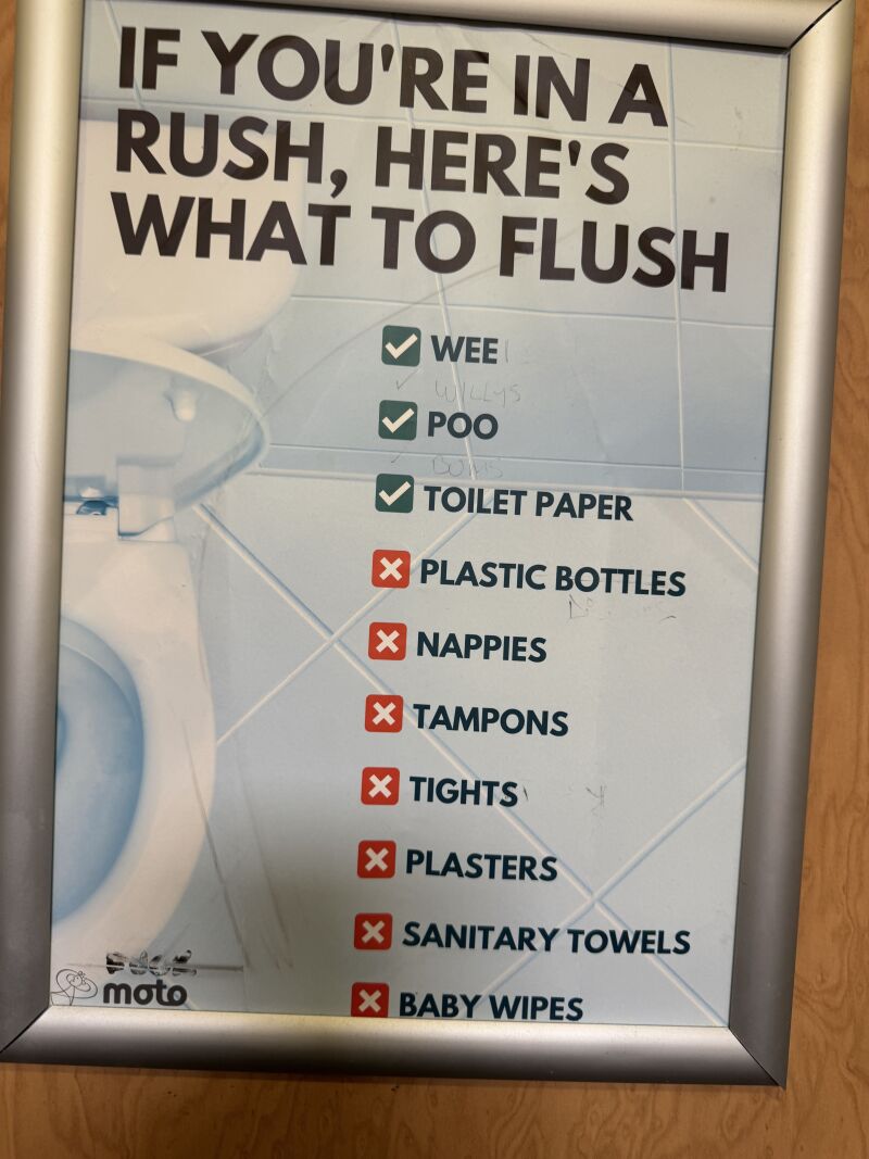 I may not be the only one because today I saw a sign in service station at Pease Pottage that said "If you're in a rush, here's what to flush" and this correctly listed wee, poo and toilet paper with a tick, but then listed some things that you can't flush: Plastic bottles (what?), nappies, tampons, tights, plasters, sanitary towels, baby wipes." The sign writer thinks he's defeated me and all the other people who make the clever and funny remember joke about only flushing toilet paper. But he hasn't defeated us at all. His sign is still useless. Can I flush nuclear waste, living kittens, dead kittens, the concept of regret, staples, the Empire State Building, the planet Uranus (this is clever because it also sounds like your anus), the hair shirt of Thomas Beckett... I could go on. By listing everything in the world. The sign only tells us a few things that can be flushed and a few more that can't, but it leaves a Universe full of stuff where the flushing status is unconfirmed. Including the water already in the toilet.
