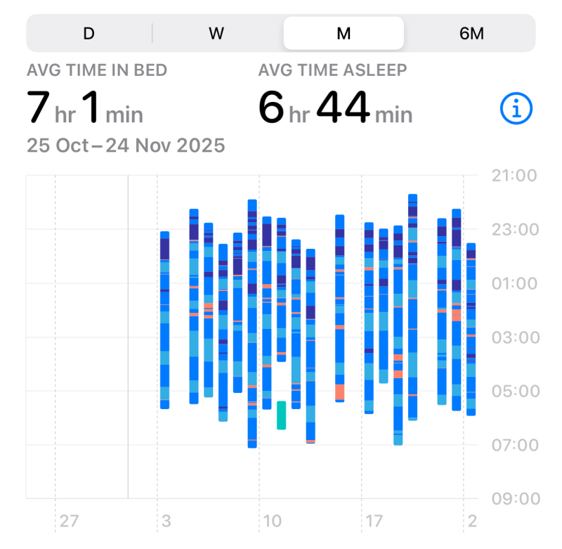 I've been wearing my watch to bed most nights in the last month to check out my sleep patterns. I am not entirely sure how my watch knows, but it can tell me when I was awake, when I was in REM sleep, Core Sleep and Deep Sleep. I suppose it also shows me what time I go to bed and what time I wake up, which as you can see is nearly always before 6am and very very rarely after 7. I'd say this month hasn't been very typical, in that half the time I have been woken by my alarm (which I don't bother setting at home as I have a free 6am alarm called Ernest Herring), but sleep past 7am is rare luxury in my life now.