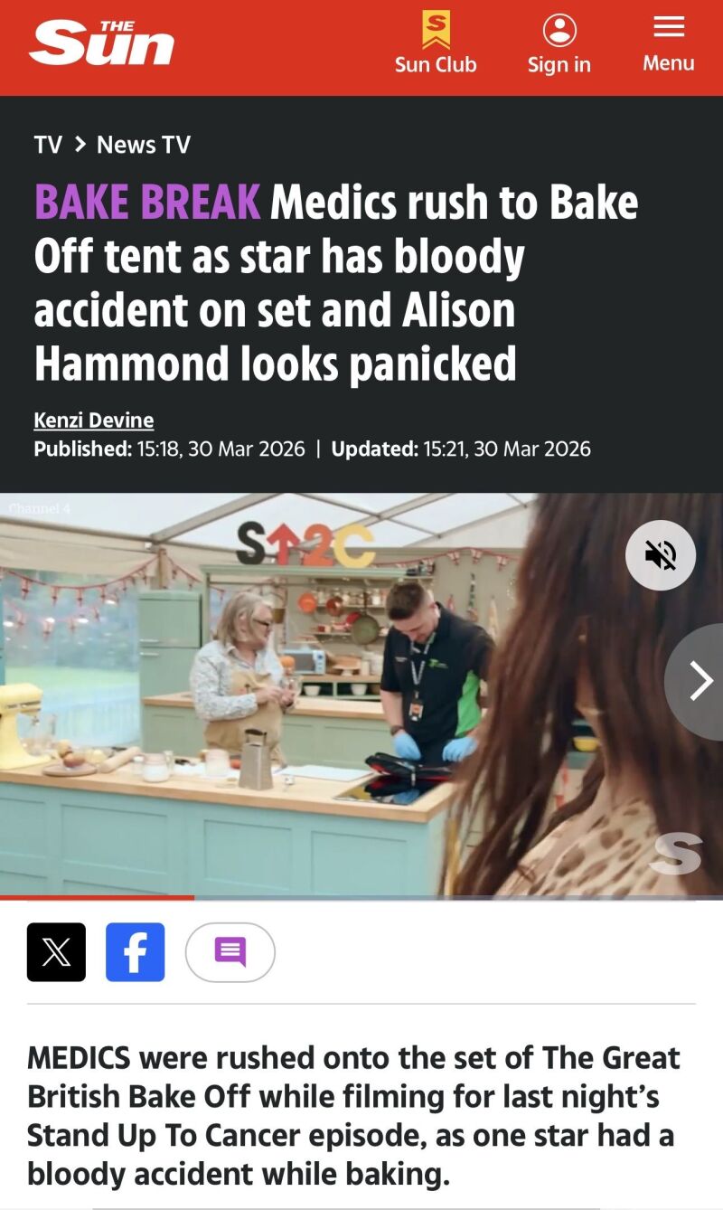 I did however, make headline news in all the tabloids for spilling blood. It's OK if it's your own. The journalists though have treated my fairly minor apple peeling accident into something that sounds much more serious. The Sun said "Medics rush to Bake Off tent as star has bloody accident on set and Alison Hammond looks panicked."