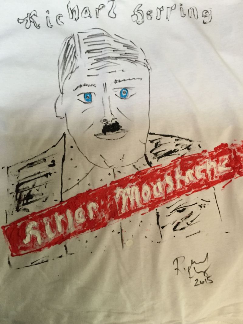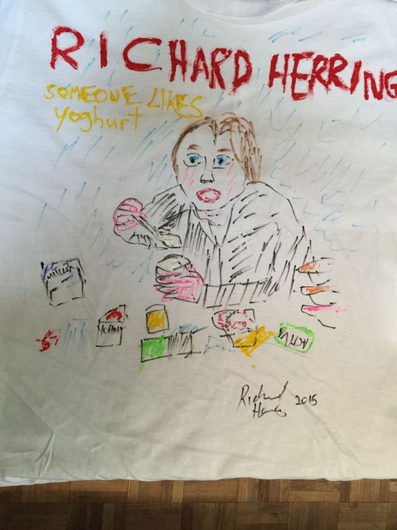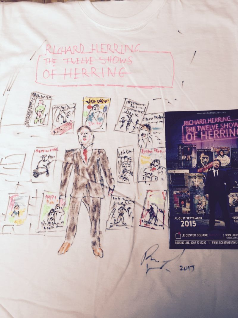 The poster T-shirts require a little more time and care than the Kickstarter ones as they at least have to partly resemble the show images they are based on. I made a start as I am on Sunday Brunch at the weekend and they want me to show people what they could be getting. Even though I am not sure that's a very good idea as it can surely only look me look deluded and insane (both in terms of my artistic skills and the fact that these monstrosities would encourage a viewer of Sunday Brunch to come to any of my shows), I can't resist the opportunity to look insane and deluded on live TV, so I knocked off a Hitler Moustache (surprised myself with how good this one was, though it makes Hitler look quite nice - though then again it's me, not him on the poster) and a Someone Likes Yoghurt (I created a new artistic style for this one - it's horrific but I like my use of wide eyes and pink felt tip to make myself look suitably surprised and embarrassed). I then did a 12 shows T shirt as a prize for this month's monthly subscriber draw and I think this one is actually pretty good. I know I am not going to be able to make the drawings look accurate, because I am shit at drawing, but this one really subtly apes all the previous programmes (nearly all recognisable) and somehow I have accidentally managed to do a picture of myself that is recognisably me. I am worried that I might actually be becoming a good artist. But not that worried.