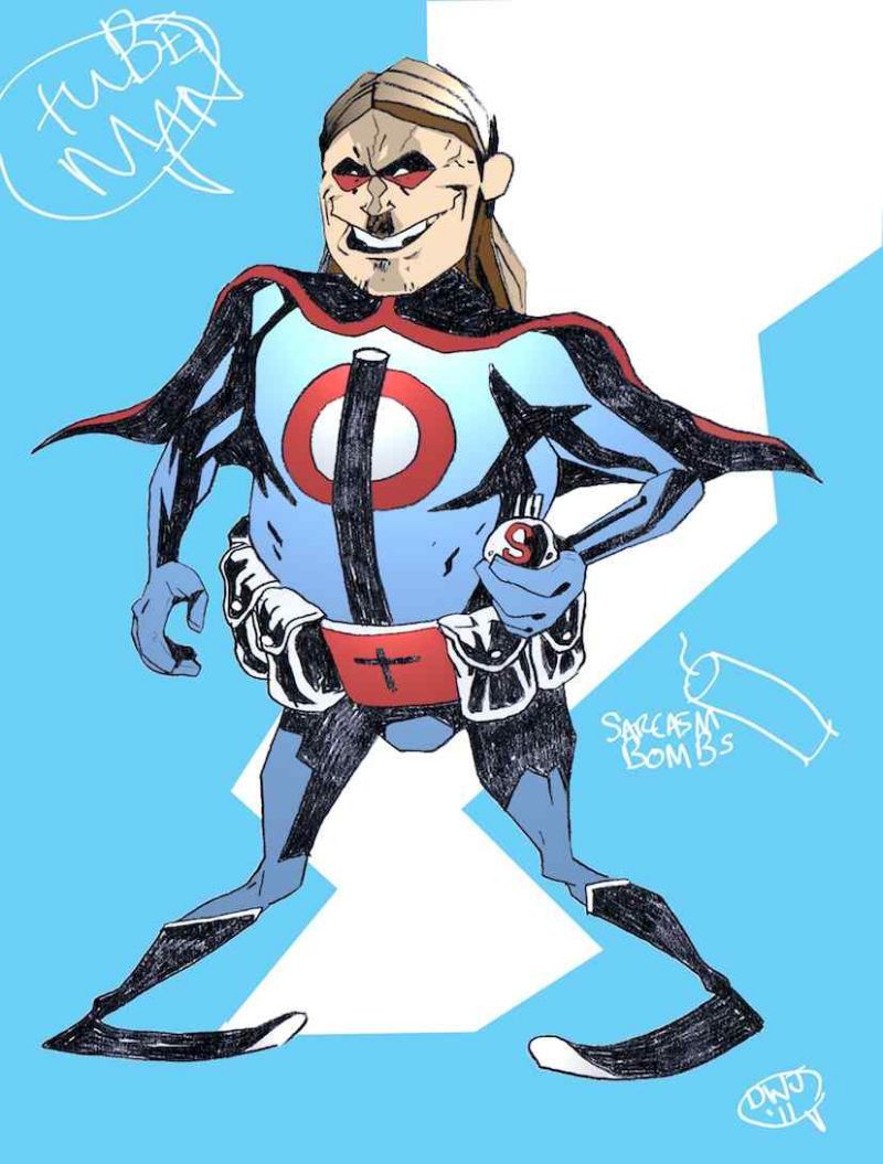 And David Jenkins has drawn this fabulous picture of his imagining of Tube-Man. Who could it be behind that mask? He sure looks cross. No one would suspect a mild-mannered comedian, would they?